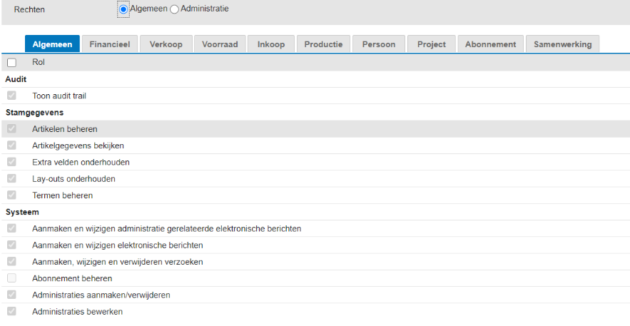 Indien u klikt op: "Administraties: Toegangsrechten" kunt u de Administraties toekennen.