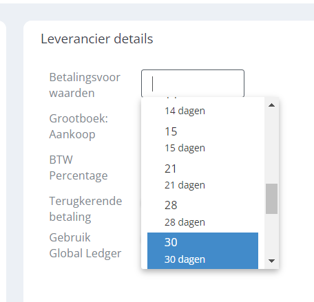 Betalingsvoorwaarden worden op relatie niveau in uw boekhoudpakket ingesteld.