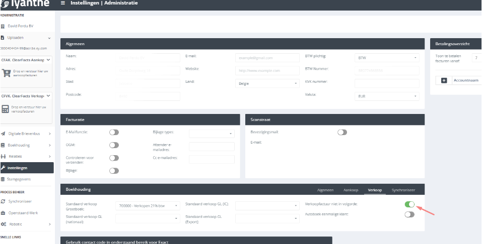 In de instellingen van de administratie kun je instellen dat de verkoopfacturen niet in volgorde geboekt hoeven te worden. Zie hiervoor onderstaande printscreen.