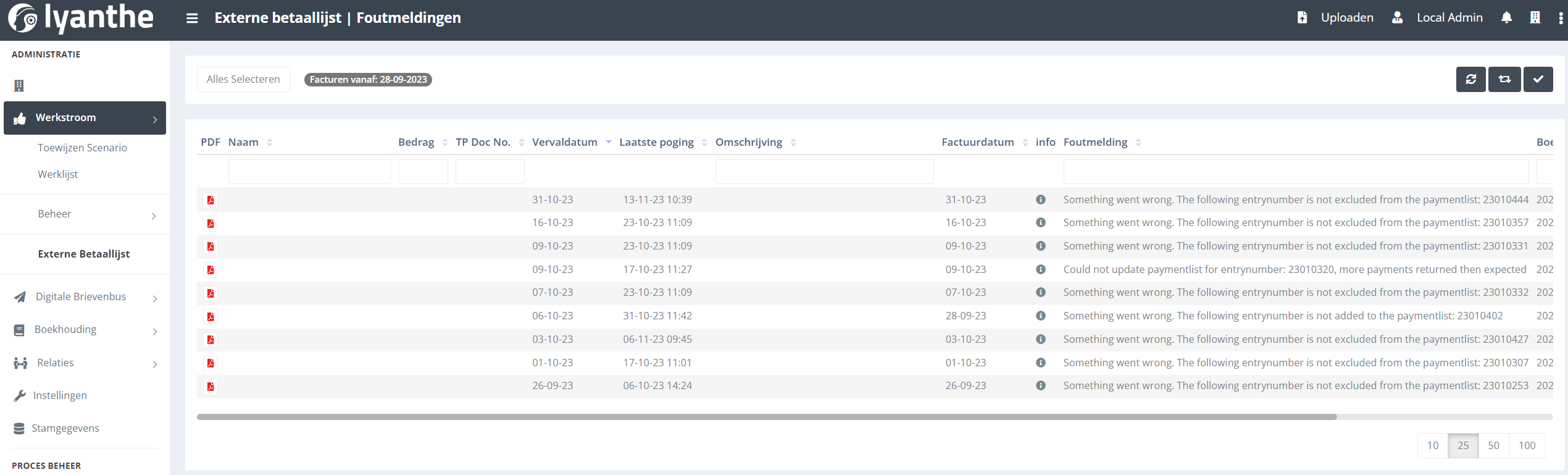 Hierin komt een overzicht te staan bij welke facturen een fout is opgetreden bij het updaten van de betaallijst over de laatste 6 weken. In dit overzicht is het mogelijk om opnieuw een poging te doen de betreffende facturen in of uit de betaallijst van uw boekhoudpakket zetten. Of u kiest ervoor om het handmatig op te lossen, dit wil zeggen dat de melding verdwijnt uit de lijst en u de factuur handmatig moet corrigeren in uw boekhoudpakket.