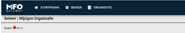Onderstaande foutmelding krijgt u wanneer de koppeling tussen MFO en Exact verbroken is.