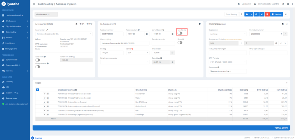 Creditfacturen worden in Lyanthe aangemerkt door Ja / Nee. Dit betekend dat geen (-) bedragen aangegeven dienen te worden bij het verwerken van facturen zoals gebruikelijk in Boekhoud Gemak (Multivers).