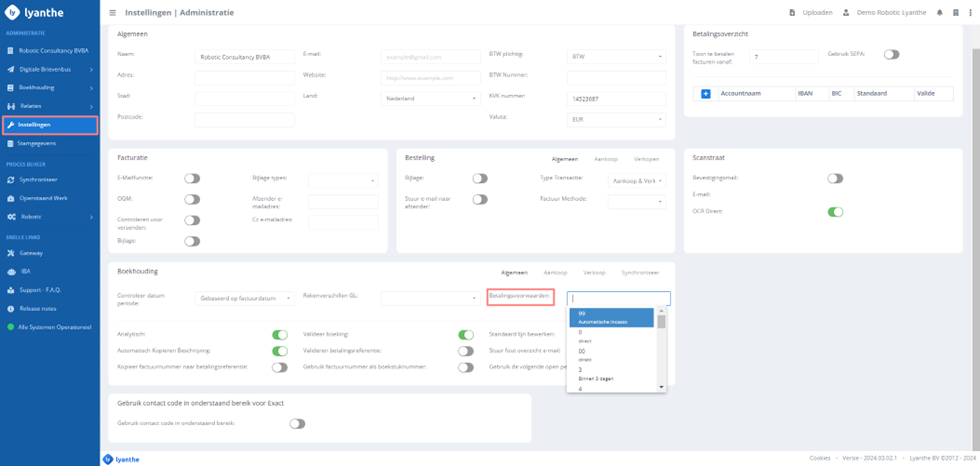 Daarnaast kan via Instellingen in het Lyanthe MFO Portaal een standaard betaalconditie (betalingsvoorwaarde) geselecteerd worden. Deze zal toegepast worden indien geen betaalconditie op de stamgegevens van de relatie bekend is (voor zowel inkoop als verkoopfacturen).