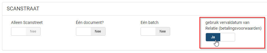 - Zet gebruik vervaldatum van Relatie (betalingsvoorwaarden) op Ja. Deze instelling staat onder Scanstraat.