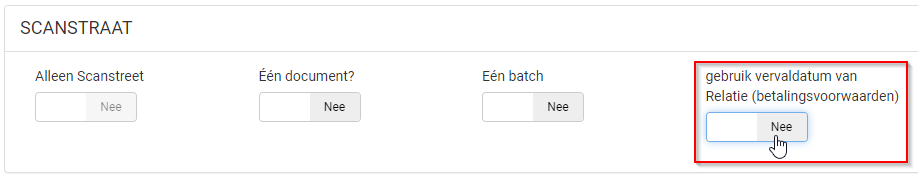- Zet gebruik vervaldatum van Relatie (betalingsvoorwaarden) op Nee. Deze instelling staat onder Scanstraat.