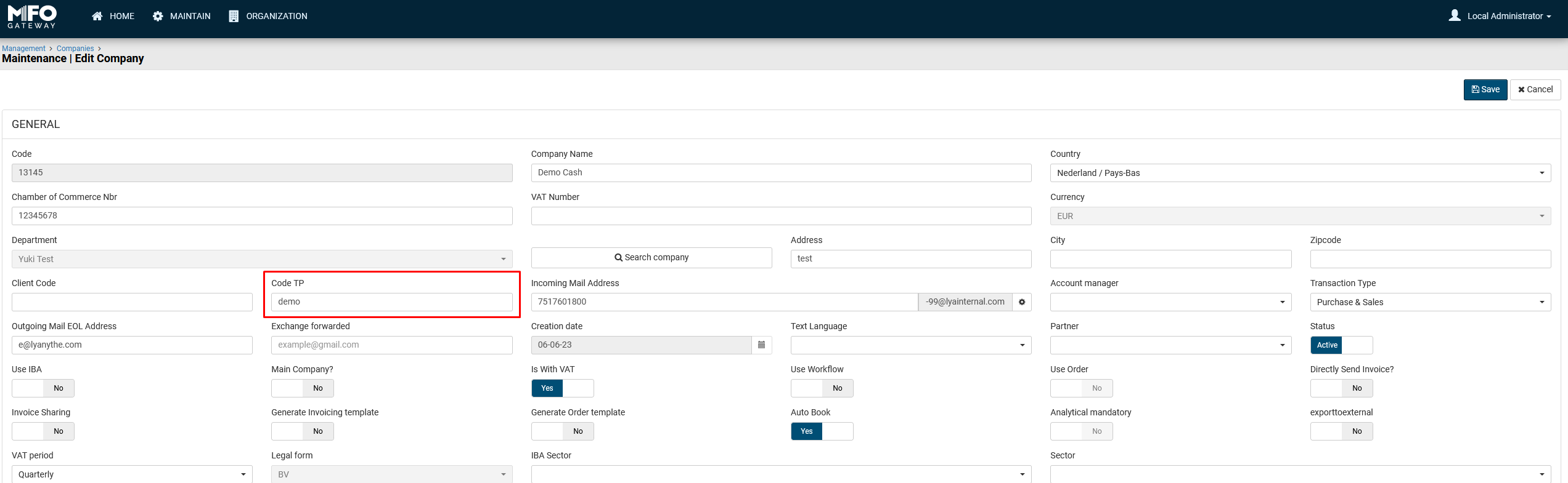 Het eerste element dat verkeerd ingesteld kan zijn is de Code TP (of Third party code) van de administratie binnen Lyanthe. U kunt deze terugvinden of aanpassen in Gateway: