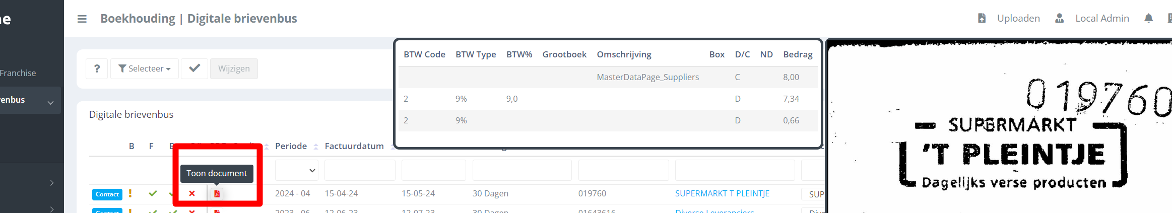 Door met je muis over het pdf icoontje te "hooveren" verschijnt een preview van de eerste pagina van de factuur met daarnaast het boekingsvoorstel. Op deze manier kunt u snel en efficiënt nagaan of de factuur correct geboekt wordt. Door op het PDF icoon te klikken opent de PDF in een nieuw browservenster.
