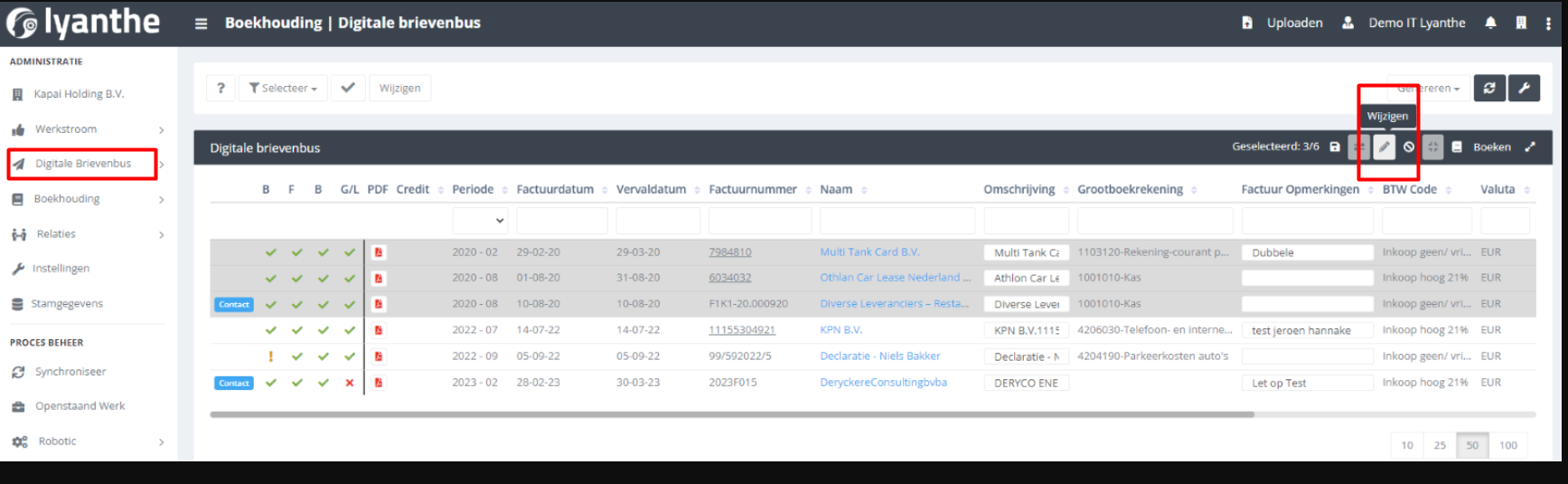 In de Digitale Brievenbus selecteert u de facturen die u wilt wijzigen door deze aan te vinken.