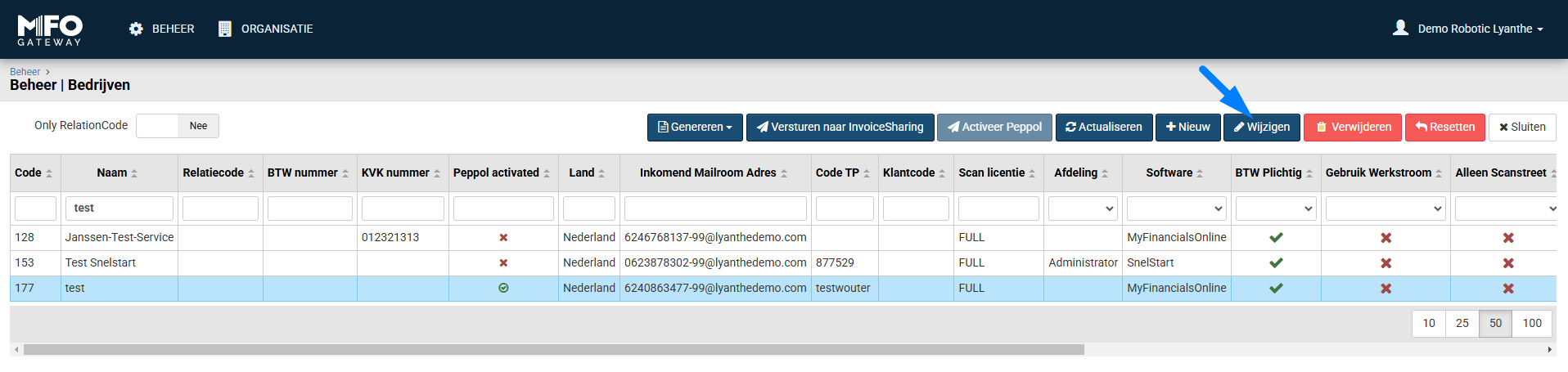 2. Kies vervolgens de administratie/het dossier, waarvoor u "Alleen peppol Workflow" wilt activeren en klik op "Wijzigen".