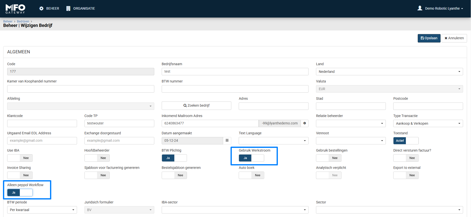 3. Binnen deze "wijzigen bedrijf" pagina, kunt u nu het veld "Alleen peppol Workflow" activeren.