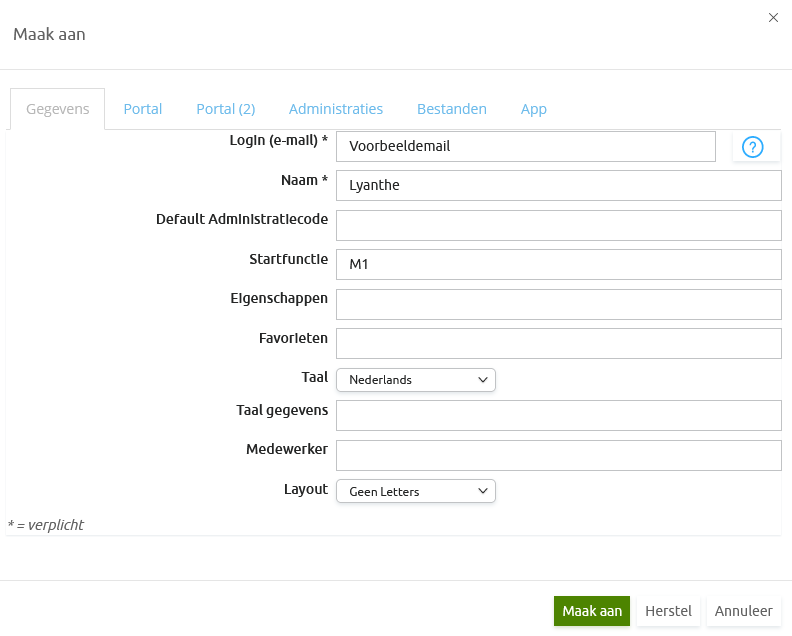 - In het pop-up scherm wat volgt dient u de volgende gegevens in te vullen: Login en Naam. Zorg dat u toegang heeft tot dit emailadres, u dient later in het proces een wachtwoord aan te maken met de link die naar dit emailadres gestuurd wordt. Klik vervolgens op "Maak aan"