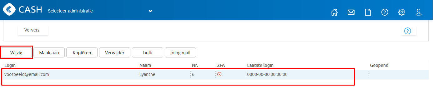 - Vervolgens ziet u de nieuw aangemaakte gebruiker in het overzicht erbij staan. Selecteer de gebruiker en klik op "Wijzig".