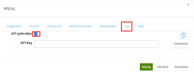 - In het scherm dat nu opent dient u het API tabblad te selecteren en op deze pagina het vinkje API gebruiker aan te zetten. Vervolgens klikt u op "Wijzig".